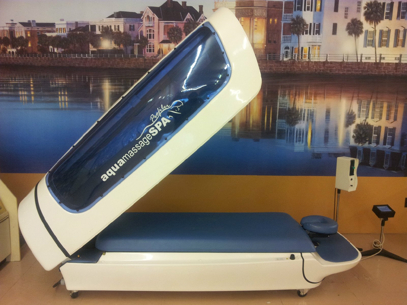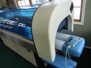 The strange looking water massage table above is called the AquaMassage and we sell refurbished models between $4k and $9k. Client lays face down and extreme water pressure comes down from the top. Most effective model on the market today and large unit. We sell with a warranty.